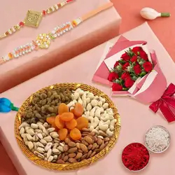 This is a combo gift of: a) Designer Rakhi Set of 5 b) 12pcs Ferrero Rocher Moments Chocolate Pack c) Complimentary Roli Tika N Chawal d) Complimentary Message Card