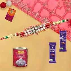 This is a gift of: � A Kundan Rakhi � Cadbury Dairy Milk Silk Bubbly (50g) � Complimentary Roli Tika N Chawal � Complimentary Message Card with Free Rakhi