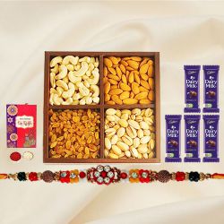 This is a gift of: � Set of 2 Kundan Rakhi � Cadbury Temptation Rum N Raisins (72g) � Cadbury Temptation Almond Treat (72g) � Complimentary Roli Tika N Chawal � Complimentary Message Card with Free Rakhi