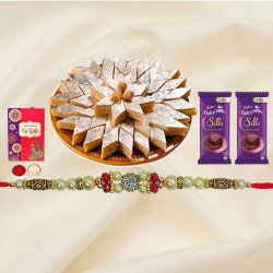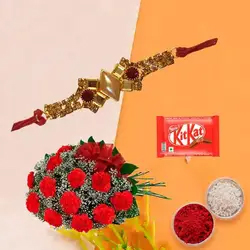 Appropriate for brightening up Raksha Bandhan celebration, this Graceful Kundan Rakhi N Cadbury Temptation Delight complemented with a free sacred Rakhi, Roli, Tilak and Chawal, will cast a charming spell upon the moment.