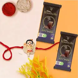 Make this Raksha Bandhan unforgettable with a premium gift combo that symbolizes love, tradition, and indulgence. Featuring a pair of exquisite Kundan Rakhis, this set reflects timeless elegance and festive spirit. Complementing the rakhis are two luxurious Cadbury Temptation chocolates � Rum N Raisins (72g) and Almond Treat (72g) � crafted to please every chocolate lover�s palate. Included in this gift are the essentials for the rituals � complimentary Roli Tika and Chawal � and a personalized message card to convey your love. It�s a complete Rakhi celebration in one charming package, perfect for strengthening the sibling bond.
