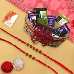 Surprise your brothers with this exquisite Raksha Bandhan combo that beautifully balances tradition and indulgence. The set features 3 Kundan Rakhis by Rakhi Sutra (SET3-09), each designed with fine craftsmanship to reflect timeless elegance. Alongside the rakhis, the gift includes three 36g Cadbury Dairy Milk chocolate bars in the beloved Roast Almond, Crackle, and Fruit n Nut variants�ideal for adding sweetness to the occasion. Completing the set are complimentary Roli Tika, Chawal for the rituals, and a message card to share your love. Celebrate the sibling bond with a gift that�s both meaningful and mouth-watering.