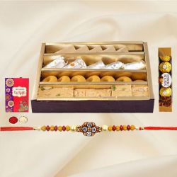 Celebrate Raksha Bandhan with this exquisite gift set featuring a set of 2 Ganesha and Krishna Rakhis by Rakhi Sutra, symbolizing divine blessings and protection. Savor the rich taste of 250g of Kaju Katli, a beloved traditional Indian sweet. Complete the festive rituals with complimentary Roli Tika N Chawal, and express your heartfelt wishes with a complimentary message card included free of charge. This thoughtful combination of divine rakhis, delicious sweets, and traditional elements is the perfect way to honor and celebrate the cherished bond between siblings on this special occasion of Raksha Bandhan.
