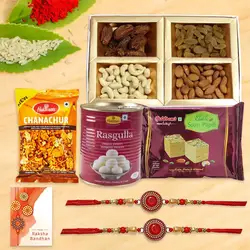 This is a gift of: � Set of 3 Peacock Rakhi by Rakhi Sutra (SET3-04) � Kaju Katli (500g) � Complimentary Roli Tika N Chawal � Complimentary Message Card with Free Rakhi