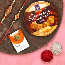 Make this Raksha Bandhan truly special with our exquisite Kundan Rakhi N Nutty Delights Hamper. Featuring a set of 3 elegant Kundan Rakhis by Rakhi Sutra (SET3-01), it beautifully symbolizes the unbreakable sibling bond. This premium hamper also includes 100g each of Mewa Delight cashews, almonds, raisins, and pistachios � a healthy and scrumptious assortment packed in a reusable basket. The quality and freshness of these nuts make them perfect festive treats your sibling will love. To honor the traditional rituals, we also provide complimentary roli tika n chawal and a heartfelt message card with a free Rakhi. This thoughtfully crafted gift harmonizes tradition with gourmet pleasures, making Raksha Bandhan celebrations truly unforgettable.