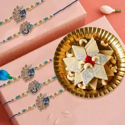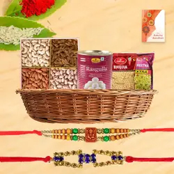 This gift hamper includes: � Set of 3 Kundan Rakhi by Rakhi Sutra (SET3-01) � Mewa Delight Cashew (100g) � Mewa Delight Almond (100g) � Mewa Delight Raisin (100g) � Mewa Delight Pistachio (100g) � A Resueable Basket � Complimentary Roli Tika N Chawal � Complimentary Message Card with Free Rakhi