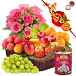 This gift hamper has - � 2 pcs Rudraksha Rakhi � 4 pcs Cadbury Dairy Milk Fruit n Nut (36 gms each) � 4 pcs Cadbury Dairy Milk Crackle (36 gms each) � 4 pcs Cadbury Dairy Milk Roast Almond (36 gms each) � 5 pcs Cadbury Dairy Milk (13 gms each) � Auspicious Roli Tika n Chawal � Complimentary Card � Wooden Tray
