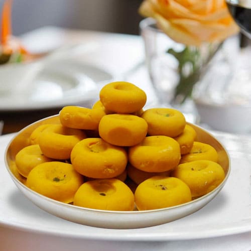 Buy this bowl of yummy 1/2 Kg (Gross Weight) Kesaria Pedas from Haldirams and make your dear one feel on top of the world.