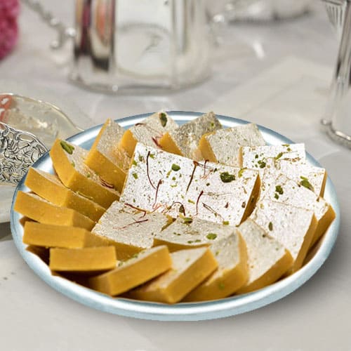 Kaju Kesar Katli from Haldiram. A mouth watering treat of Kaju Kesar Katli 1/2 kg (Gross Weight) which are sure to bring that sweet smile on the face of the recipients.