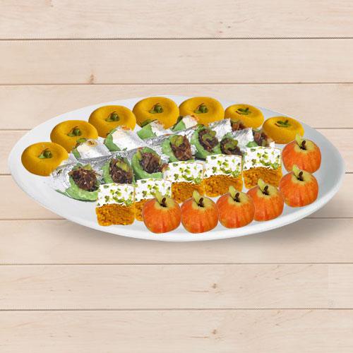 Bring the people you love closer to your heart by gifting this Delectable Assorted Premium Sweets from Bhikaram. This premium mawa sweet platter (gross wt. 1kg) has Kaju Paan, Kesar Peda, Mawa Apple, Dilkhushal loaded with your affection and fondness for them.