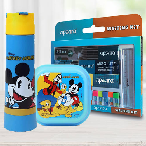 Paint a smile on the faces of your children by sending this Outstanding Mickey Mouse School Utility Combos for Kids that carries the essence of the feelings for them straight from your heart. Details: 1. Items: Disney Mickey Mouse Lunch Box, Insulated Sipper Water Bottle and Apsara Writing Kit 2. Brand: Apsara (Writing Kit) 3. Color: Multicolor (Lunch Box n Writing Kit) 4. Material: Plastic 5. Dimensions LxWxH: 28 x 31 x 2cm (Writing Kit) 6. Capacity: 450 ml (Lunch Box), 500 ml (Sipper Bottle) 7. Shape: Square (Lunch Box) 8. Other Features: BPA free, food grade, odorless and made of FDA approved polypropylene plastic (Lunch Box). BPA free and food grade, insulated (Sipper Bottle)