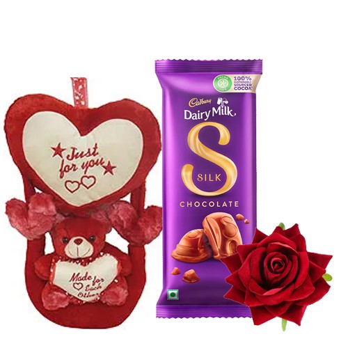 Show your intense love to your dear ones by sending them this Made for Each Other Love Teddy with Hanging Heart teamed with 1 Red Velvet Rose and 1 Cadbury Dairy Milk Silk Bar-a great and magnificent way to show how much you think of them.