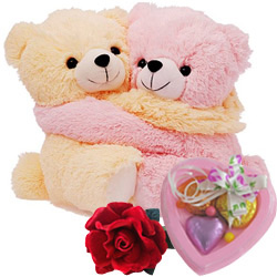 Let others feel happy as you deliver them this Wonderful Hugging Couple Teddy (16 cms) with 1 Velvet Rose and 3 pcs Homemade Chocolates with your love and affection.