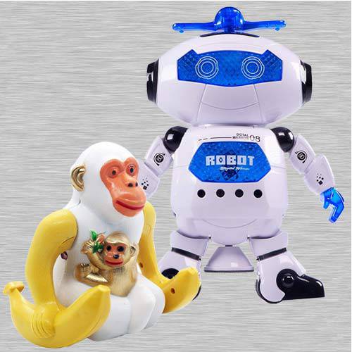 Delight your child with this Wonderful Dancing Robot N Webby Funny Orangutan and make them realize how special they mean to you. The details are as under: 1. Items: a) Multicolor Dancing Robot with 3D Lights and Music and b) Multicolor Webby Funny Orangutan 2. Brand: Webby 3. Age Group: 2 Yrs+ 4. Gender: All 5. Type of Toys: Indoor 6. Category Type: Battery Operated