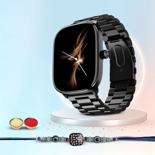 This Gift Hamper contains: � An Evil Eye Rakhi by Rakhi Sutra (EVD0475) � Noise New Macro Smartwatch with BT Calling (Elite Black) � Complimentary Roli Tika N Chawal � Complimentary Message Card with Free Rakhi