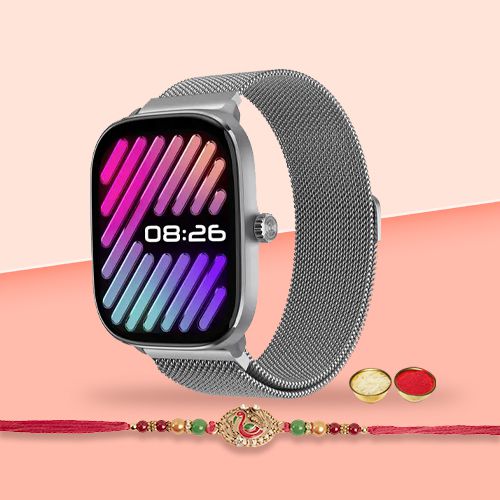 This Gift Hamper contains: � A Kundan Rakhi by Rakhi Sutra (KPRK0289) � Noise New Macro Smartwatch (Silver Link) � Complimentary Roli Tika N Chawal � Complimentary Message Card with Free Rakhi