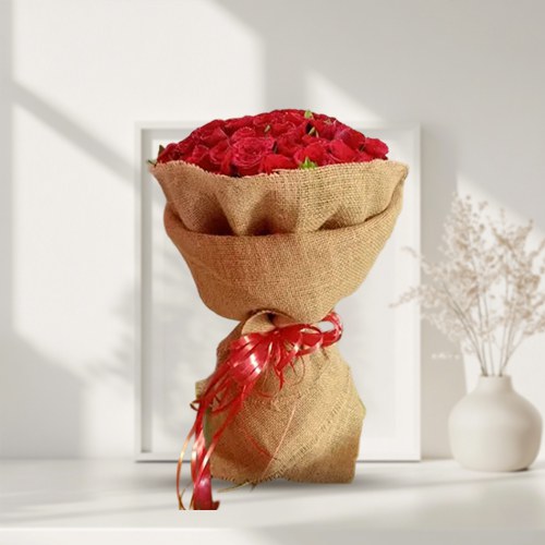 Experience the whimsical beauty of our Elegant Jute Wrapped Roses Bouquet. Comprising 20 captivating red roses, each carefully tied with rustic jute, this charming arrangement exudes a sense of natural elegance. Its the perfect gift for any occasion, conveying heartfelt sentiments with a touch of rustic charm.