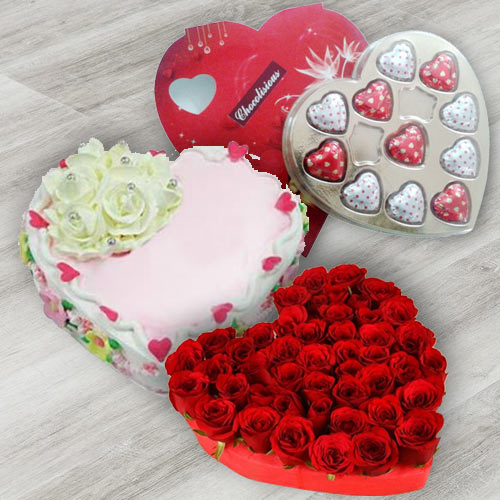 Open your heart out and say that you love, by gifting this charming online gift set. This special gift set consists of 24 Red Roses arranged in Heart Shape, a Heart Shaped Chocolate Box (10 Pcs) along with a Heart Shaped Cake (1 Lb).