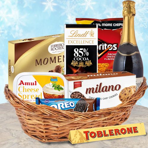 Paint a smile on the faces of the closest people in your life by sending this Magical Holiday Extravaganza Gourmet N Fruit Wine Hamper that carries the essence of the feelings for them straight from your heart. This gift hamper contains: 1. 16pc Ferrero Rocher Moments Chocolates 2. Toblerone Chocolate Bar (100g) 3. Lindt Excellence Chocolate Bar (Dark, 100g) 4. Sparkling Grape Fruit Wine (750 ml) 5. Milano Choco Chip Cookies Box 6. Oreo Chocolate Cookies 7. Doritos Nachos Chips (44g) 8. Amul Cheese Dips 9. A Gift Basket