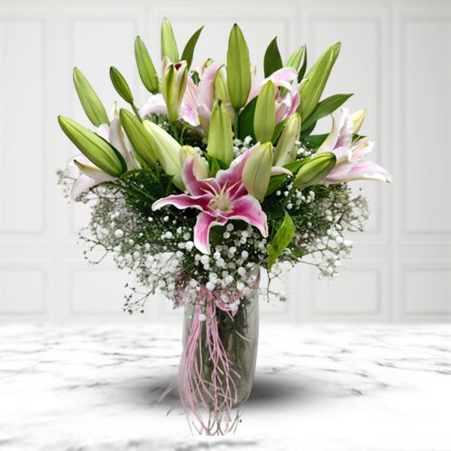Indulge in the gentle whispers of nature with this arrangement of delicate Oriental Pink Lilies. Carefully handcrafted and presented in a sleek glass vase, these blooms emanate grace and beauty, creating a serene and calming atmosphere in any room.