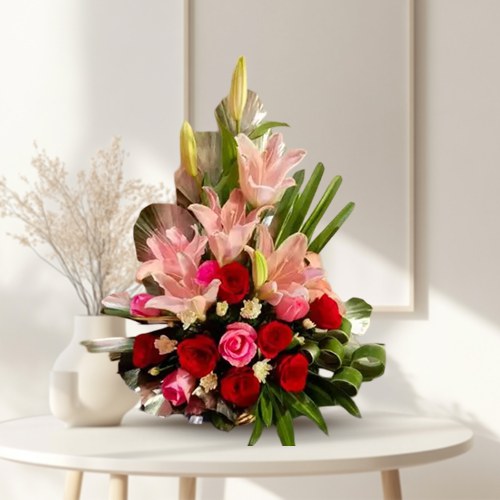 Indulge in the timeless beauty of our Refreshing Roses N Lilies Bouquet. Crafted with care, this enchanting arrangement showcases 12 radiant red roses and 6 graceful pink Asiatic lilies, elegantly entwined to symbolize everlasting love. With its captivating allure and sophisticated charm, this bouquet is an ideal gift for commemorating special moments and celebrating enduring love.