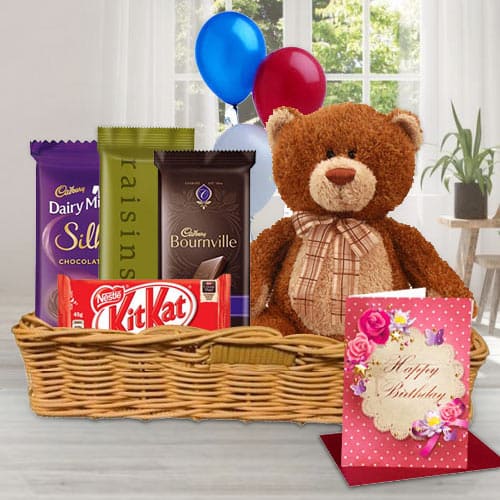 Offer the special people in your life this Wonderful Gift Hamper of Birthday Gifts N Chocolates and make their hearts leap in joy. This Gift Basket has the following items - 1) 12 inch Brown Teddy 2) Cadbury Bournville (31 gms) 3) Cadbury Temptation Rum n Raisins (72 gms) 4) Cadbury Dairy Milk Silk (60 gms) 5) Ferrero Rocher (4pcs) 6) Nestle KitKat (4 finger bar-36.3 gms) 7) Happy Birthday Card 8) 3 Balloons 9) Small Basket.