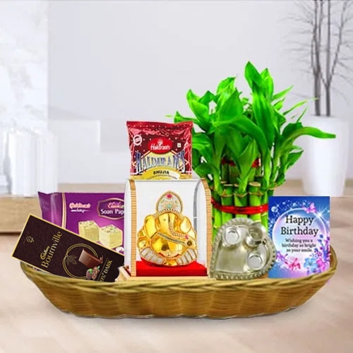 Celebration special wishes are best delivered by gifting this Attractive Birthday Gift Hamper for Him to your family and friends. This Birthday Hamper is a thoughtful gift as it contains mesmerizing items like Haldiram Soan Papdi, Haldiram Bhujia, Paan Thali, Ganesh Idol, 1 pcs Cadbury Dark Milk, Birthday Card and Bamboo Tree.