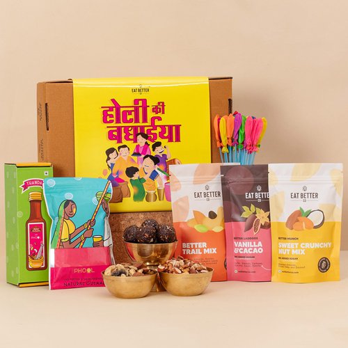 Gift this Attractive Holi Gift Hamper of Natural Gulal with Thandai N Treat Assortments to your loved ones and spread happiness. This Holi gift box contains: