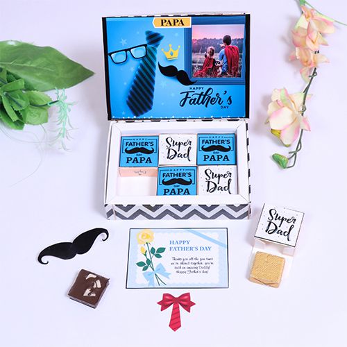Celebrate Fathers Day in style with our Best Personalized Chocolate Gift Box for Dad! This premium gift box features 6 pieces of assorted flavored chocolates, each personalized with your dads name and photo. The chocolates are filled with a delightful array of gourmet flavors, including roasted dry fruit, cranberry, paan, butterscotch, mix fruits, and chocochip. The box and chocolates are beautifully adorned with a Fathers Day theme digital print, making it a truly special and unique gift for your dad. Indulge in the rich and decadent flavors while showing your love and appreciation for Dad on his special day. Treat him to a luxurious and personalized chocolate experience that he wont soon forget. Make this Fathers Day one to remember with our Personalized Fathers Day Chocolates with Gourmet Flavors!