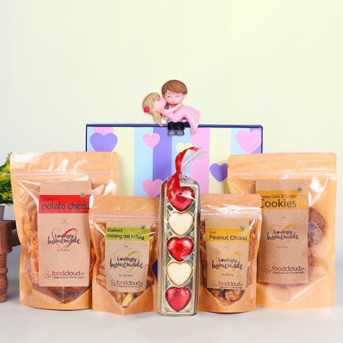 Experience a delectable journey of love and flavor with our special gift hamper. It features a delightful Couple Miniature that symbolizes your bond. Delight your taste buds with the crunchy goodness of Gur Peanut Chikki and the heavenly taste of Oats N Choco Chip Cookies. Dive into the irresistible flavor of Fiery Potato Chips and savor the unique twist of Baked Moong Dal. And dont forget to enjoy the sweet surprises of Heart Shape White Chocolate. Its a perfect indulgence for a couple who craves both love and flavor.