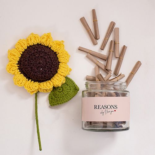 Experience the joy of unboxing love with our delightful Love in a Jar gift set. Inside, youll find a jar filled with 52 heartfelt reasons why I love you, waiting to be discovered one by one. As you explore each tender message, revel in the beauty of a crochet sunflower that accompanies this special gift. This unique combination is a testament to the deep affection I have for you.