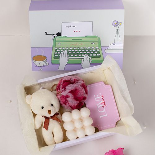 Capture the essence of love with this Delightful Valentines Keepsakes Collection. This thoughtfully curated collection showcases a Teddy Keychain to keep your loved one company, a Bubble Candle to ignite romance, Love Tokens to create cherished memories, and a Slider Box for an element of surprise. Make your special someone feel truly cherished with this delightful gift hamper.