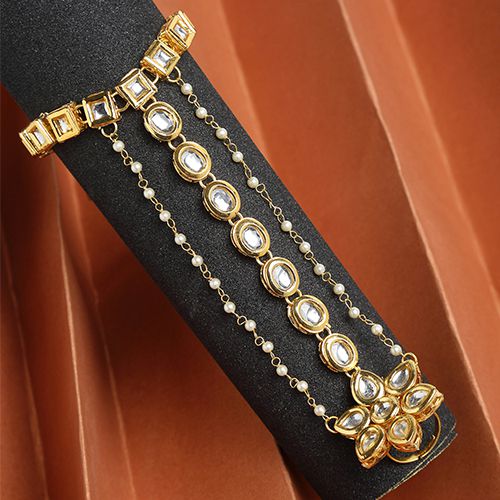 Experience the beauty and sophistication of Kundan jewelry with our stunning hand harness. Impeccably designed with carefully set Kundan stones, this piece merges traditional design with contemporary flair. Whether its for a special event or to uplift your daily attire, this hand harness brings an added touch of elegance to your style. The intricate craftsmanship and the rich sparkle of the stones make it a standout accessory. Designed for an excellent fit, it�s comfortable and secure for long wear. Store it separately in a jewelry box and avoid exposing it to water or harsh chemicals to maintain its pristine condition. Spot clean regularly to keep it gleaming. This hand harness isn�t just an accessory � it�s a symbol of grace and timeless beauty, making it a memorable and cherished gift.