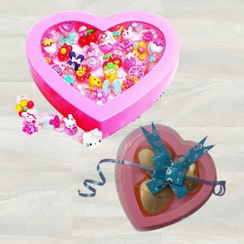 Deliver happiness by gifting this Exclusive Cartoon Finger Rings with 3 Pcs Heart Shaped Chocolates to your children. The details of the gift are: