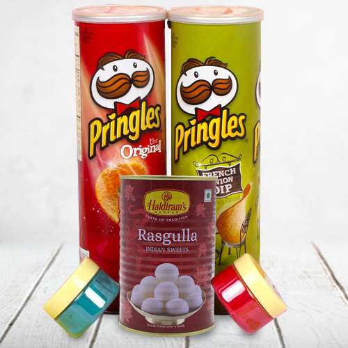Exclusive Haldiram Rasgulla with Pringle Chips n Herbal Gulal for Holi