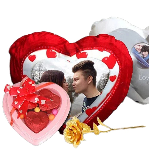 Delight your loved ones with this Exclusive Personalized Love Gift of a Heart Shape Personalized Cushion with a 3 pcs Heart Shape Handmade Chocolate n a Golden Rose and make them realize how special they mean to you.
