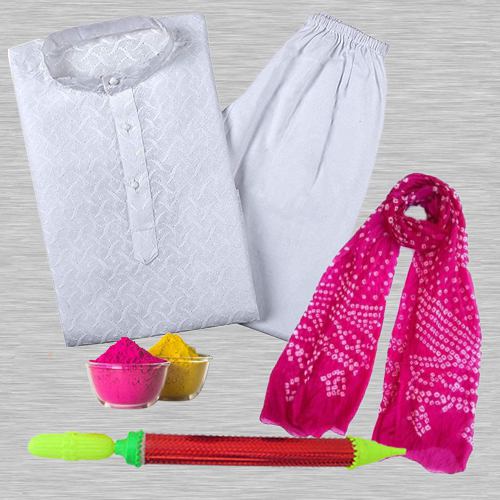 Online delivery of best wishes along with this Grand Holi Celebration Gift Hamper for your dear ones. This delightful Hamper is packed with Long Pichkari, Free Gulal, Kurta Pajama Set N Chunri Dupatta