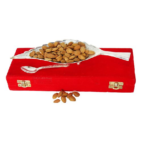 A graceful blend of utility and aesthetics, this dry fruit gift set includes a Leaf Shaped Silver Plated Bowl and an elegant Silver Plated Spoon, paired with 100g of crunchy almonds. Whether for Diwali, a return gift, or a corporate token, this box delivers tradition and elegance in one go. The rich red gift box enhances its presentation, making it ready to impress at first glance. Ideal for those who value class and thoughtful gifting, this set is both functional and festive. A timeless choice to celebrate any occasion.