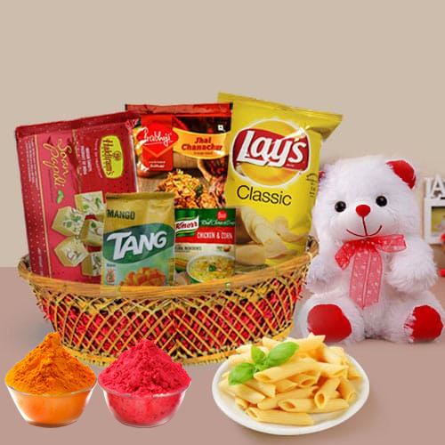 Moments turned out to be very special by ordering this Innovative Hamper Basket with Everlasting Joy and make others feel happy This Gift Basket is crafted with 6 inch Teddy, Haldiram Chanachur, Haldiram Soan Papdi, CCD Chips Pkt, Tang Juice Packet, Maggi Pasta Pack and Knorr Soup with Free Gulal