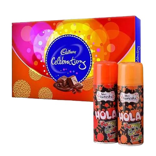 Celebration special wishes are best delivered by gifting this Kuch Meetha Ho Jae gift on Holi to your family and friends. This special Holi Gift has a box of Assorted Cadbury Chocolates (118g) with 2qty of Holi Colour Shots (150ml each).