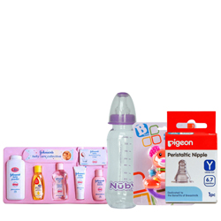 Create a beautiful world for your loved ones by sending this Exclusive New Born Special Baby Care Gift Set from Johnson wrapped up in the essence of your love and warm feelings. This Gift Set contains Johnson Baby Care Collection Kit, Pigeon Peristaltic Nipple, Nuby Milk Bottle 240ml and B Kids Lovely Lion Teether.