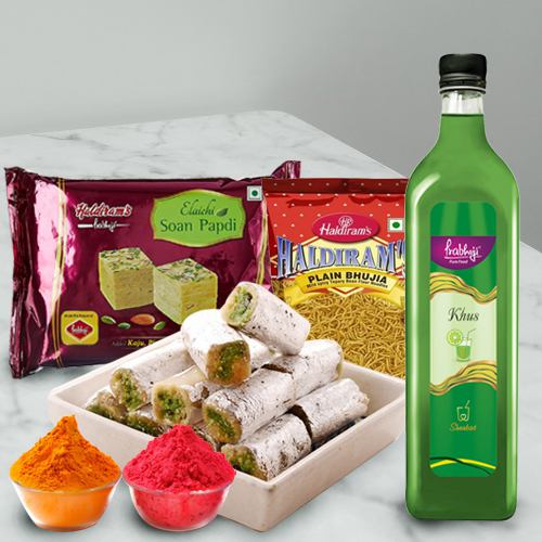Transmit your heart-felt wishes to your revered ones during the color carousal by delivering to them this Luscious Glee Cluster from Haldiram and make their festivity a gladsome one. This Succulent Holi Cluster encompasses 700 gms Bottle of Haldirams Khus Syrup, 200 gms Pista Rolls from Haldiram, a Pack of 200 gms Haldirams Soan Papdi, 200 gms Haldirams Bhujiya and Free Herbal Gulal.