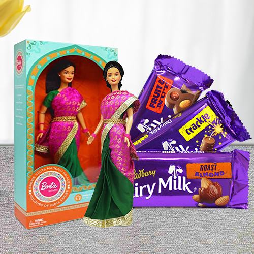 Bridge the miles between you and your little sister with this Marvelous Barbie Madurai Visit with 3 pcs Assorted Cadbury Chocolates (Fruit n Nut, Crackle, Roast Almond - 36 gms each).