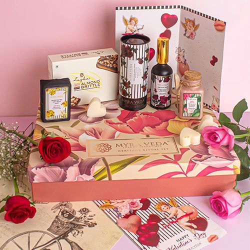 Spoil your loved one with a luxurious gift box that is sure to impress. Our Myra Veda Magic: A Valentines Day Spell is filled with indulgent treats to pamper and rejuvenate. Experience the delicate scent of roses with the Pure Rose Water, a hydrating mist that will leave your skin feeling refreshed. Choose from our Clays of Earth collection and discover the wonders of Any One Organic Myra Veda Clay, a natural beauty secret that will leave your skin glowing. And thats not all - this gift box also includes the Cupids Hope Handcrafted Vegan Soy Wax Bubble Candle, setting the perfect ambiance for a romantic evening. To satisfy their sweet tooth, weve included Loykas Original Almond Brittle Chocolates, a pack of four pieces of pure bliss. With this gift box, you can give your loved one the ultimate pampering experience.