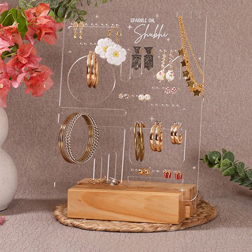 Alpha-numeric order id at: [email protected] or Whatsapp at +91 7980092029.Say goodbye to tangled necklaces and misplaced earrings with our Organize and Shine: Personalized Sparkle On Jewellery Stand. This sleek and functional stand provides a dedicated space for all your precious accessories, helping you keep them in pristine condition. The personalized touch adds a sense of identity and makes it a special gift for yourself or a loved one. Let your jewelry shine as it deserves, while staying perfectly organized and within reach.