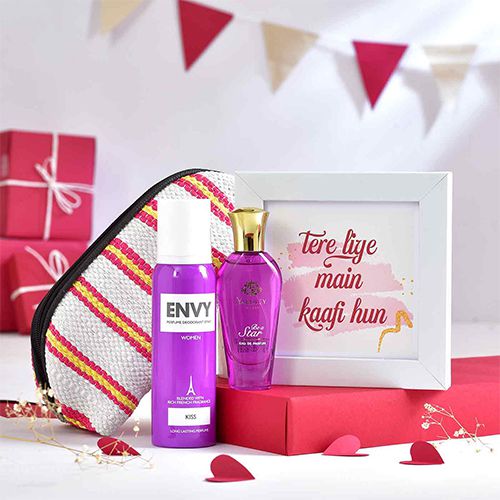 Create a picture-perfect surprise with our Picture Perfect Surprise gift set. Featuring a customized photo frame, you can add a personal touch to your cherished memories. Indulge in the captivating Envy Kiss Perfume for Women and experience the celestial fragrance of Yardley London Be a Star. As an added bonus, this set includes a sustainable multicolored washable pouch made from recycled plastic, allowing you to keep your essentials stylishly organized while being environmentally conscious.