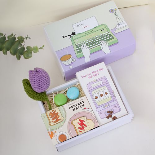Experience love in a box with this enchanting gift hamper. Fall head over heels for the handcrafted beauty of the Tulip Crochet Flower, a symbol of blossoming affection. Indulge your senses with the delectable You Have My Heart Chocolate, a sweet declaration of love. Each time you use the charming Bookmark, youll be reminded of the love-filled moments spent reading. And dont forget the 2 Macaroon Soaps, a delightful way to pamper yourself and feel cherished. This slider box is the perfect expression of love and affection.