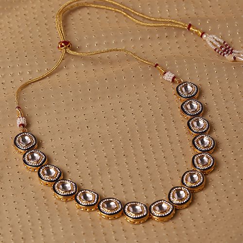 The Timeless Kundan Charm neckpiece exudes an enchanting appeal with its meticulously crafted Kundan stones. This piece is designed to enhance your elegance no matter the occasion.