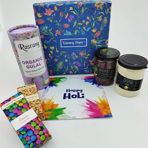 Click to deliver this Ultimate Holi Hamper of Assorted Treats with Gulal that delivers happiness instantly when unwrapped. This holi hamper is filled with: